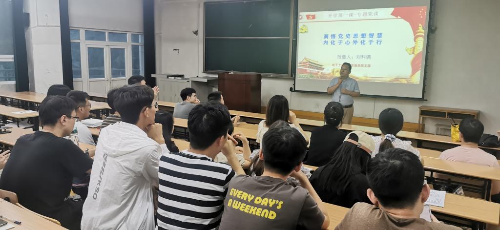 按照beat365关于“开学第一课”活动中的相关要求,电子工程学院仪器系教工党支部书记、省级优秀共产党员刘科满教授分别于2021年9月8日14:00在鄠邑校区B121为我院本科生党员,9月9日19:00在雁塔校区东阶301为研究生党员讲授题为《洞悟党史思想智慧 内化于心外化于行》的专题党课,本次活动有200余名学生党员参加。