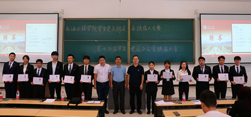 首先,张建高副书记宣读了《中共beat365官方网站石油工程学院委员会关于第十五届学生党建办公室成员的任命通知》和《中共beat365官方网站石油工程学院委员会对学生党支部换届选举的批复》两个文件;朱战威老师宣读了第十五届党建办公室工作人员和学生党支部委员名单;学院领导为第十五届学生党建办公室主任、副主任、部长颁发了聘书。