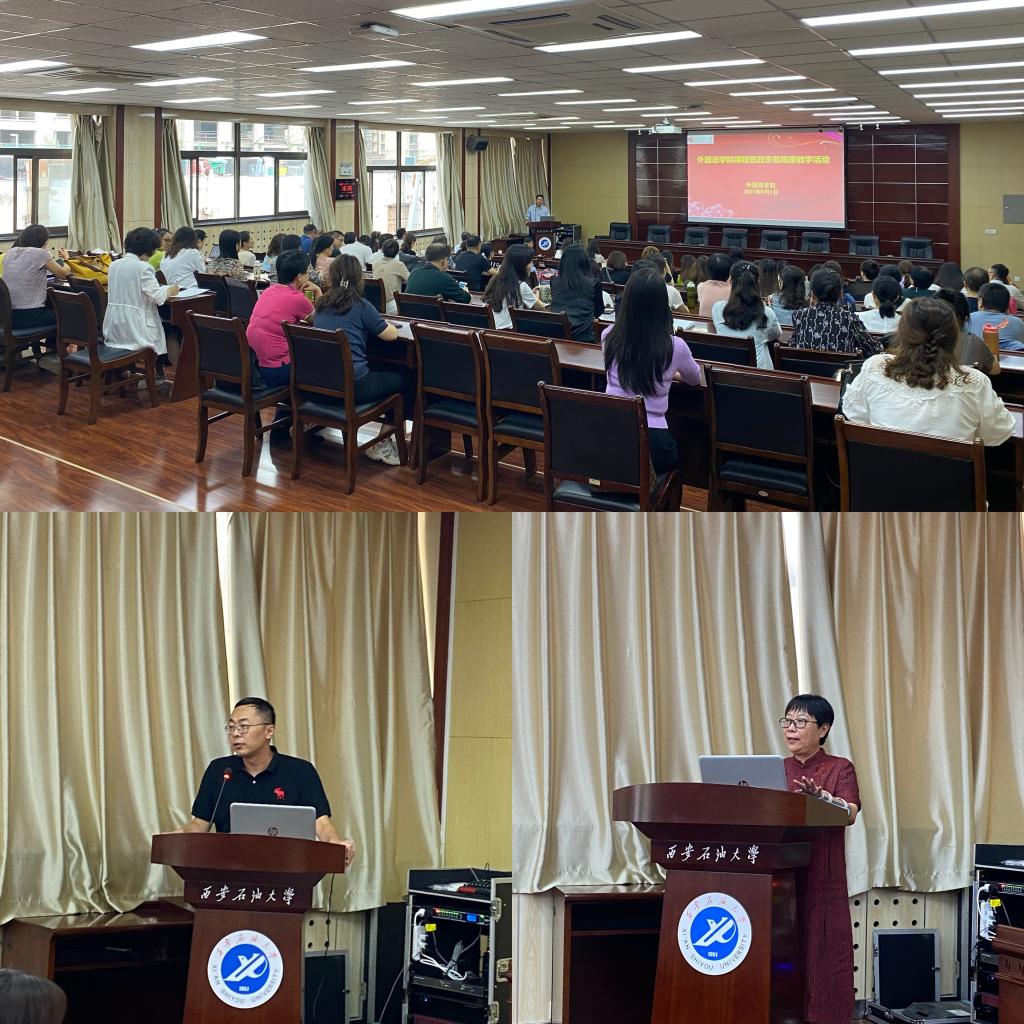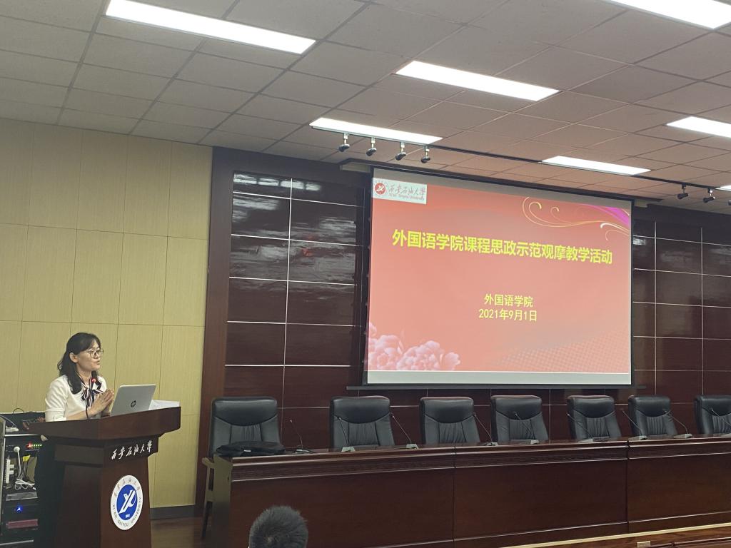 为深入挖掘拓展我院各门课程思想政治元素,充分发挥各门课程的思想政治教育功能,切实把思想政治工作贯穿教育教学全过程,提升思想政治教育亲和力和针对性,形成全程育人、全方位育人格局,外国语学院院于2021年9月1日下午在雁塔校区第五会议室举行课程思政示范观摩教学活动。学校教务处副处长吴勋、外国语学院党委书记田虹霞、院长于艳英、副院长刘辉及外国语学院全体教师岗教师参加了此次观摩教学活动。观摩活动由陈武副院长主持。