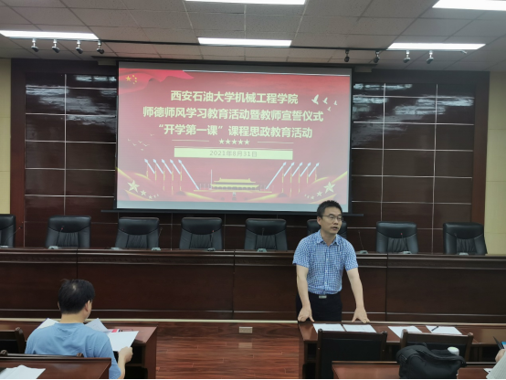 为热烈庆祝中国共产党成立100周年,全面落实习近平总书记在党史学习教育动员大会上的重要讲话精神,按照beat365官方网站《关于2021学年秋季学期开展“开学第一课”课程思政教育活动的通知》的相关要求,8月31日下午,机械工程学院在雁塔校区第五会议室开展“开学第一课”课程思政观摩学习活动。机械工程学院党委书记蔡建文、院长窦益华及学院全体教职工参加了学习活动。