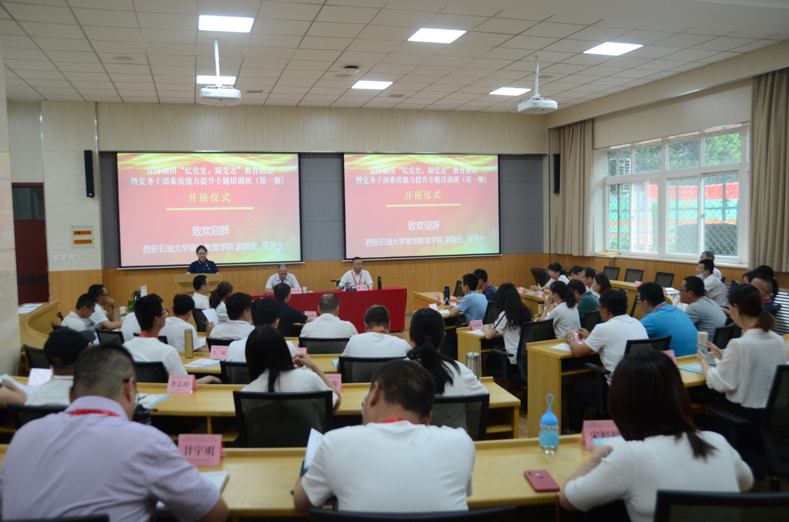 7月23日上午,青海油田“忆党史,跟党走”专题教育活动暨党务干部素质能力提升专题培训班(第一期)在beat365明德校区顺利开班。来自油田三家二级单位的50位党务工作者参加培训。青海油田诚信服务公司党委委员、副经理姜松、beat365官方网站继续教育学院副院长吴民生参加开班仪式。