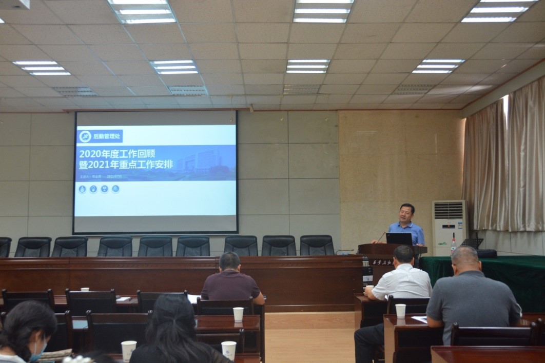 随后,苟金虎处长对后勤2020年的工作成效进行了简要回顾,对全体职工共同努力取得的成绩表示积极肯定和鼓励,再进一步结合学校今年工作要点、主要工作任务分解表安排部署给后勤的工作和要求,把上半年的工作的具体落实和完成情况进行了总结、分析。同时,又根据当前工作实际,把暑假及下半年工作进行了安排,重点要落实、实施好各项新学期开学准备工作;新建学生公寓宿舍的设施安装配置、教室功能改造等维修改造,以及校园整治工程,同时要严密做好暑期疫情常态化防控,尤其是各校区室内重点区域消杀和通风,加强教学、科研及学生公寓等门禁管理;做好暑假留校学生的生活及学习保障;落实好暑期室内外重点区域(尤其是鄠邑校区)的防汛抗汛工作;加强暑期工作人员防暑降温、劳动保护及规范操作管理等。他还要求,下半学期在完成好疫情防控常态化下各项保障和服务工作的同时,要重点做好70周年校庆服务保障、落实好文明校园创建等工作。