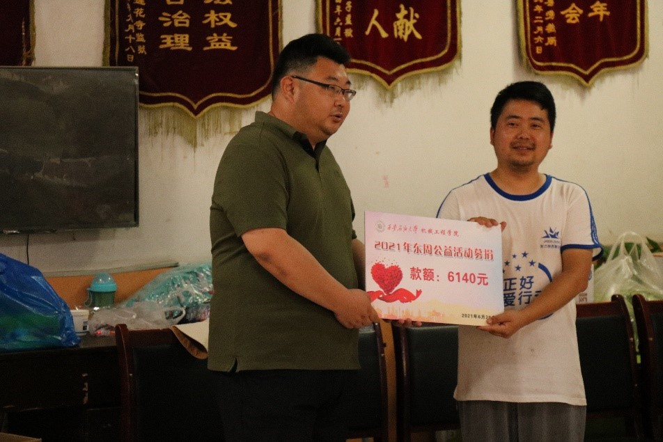 到达儿童村,机械工程学院的师生受到了孩子们的热烈欢迎,作为儿童村的“老朋友”,大家彼此并不陌生,很快融合在一起,说说笑笑。围绕党史主题教育,大家开展了 “我为群众办实事”实践活动,刘冰副书记代表学院将前期一周募捐的善款6140元悉数赠予儿童村,并为孩子们送上了募捐的衣物、书籍和购买的肉、蛋、奶、蔬菜、水果,表达了师生们的良好祝愿。随后,团委书记文爱国老师对此次主题实践活动做了讲话,他强调:今年是中国共产党建党100周年,在风雨百年的进程中,党始终为了广大人民群众的根本利益而奋斗,正因为有党的领导与关怀,儿童村的孩子们才有了温暖的生活环境,他勉励儿童村的孩子们一定要听党话、感党恩、跟党走,健康成长,努力成才,回报社会;希望党员同学们传承好二十四年前机械学子公益活动的初心,敢于担当,勇于作为,跑好“大手拉小手,爱心暖东周”的接力赛,风雨无阻,矢志不渝,坚持为儿童村的孩子们送去精神上的支持、生活上的补给、学习上的提升,让纯真的“伙伴关系”永续,让纯洁的爱心薪火相传。