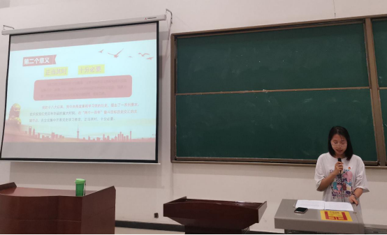 何思怡同学回顾了共产党百年奋斗的光辉历程和历史性贡献,从什么学习党史,怎么学习党史,学好党史做什么等多个方面来进行宣讲。
