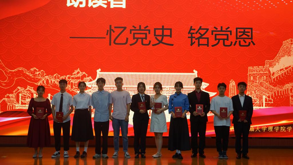 为迎接建党百年华诞与建校七秩校庆,理学院团委学生会举办第一届“朗读者——忆党史 铭党恩”朗诵比赛。决赛于2021年6月10日19:00—21:00在鄠邑校区弘石学术报告厅成功举行。理学院丁亦喆老师、庞波老师、林晔老师及学生代表甘友斌、任学凯、张鹏、周星友、张晶、闫艺担任评委。学校各院系学生会主席受邀观赛。理学院20级全体本科生与各个院系十三支选手代表团共同参与。