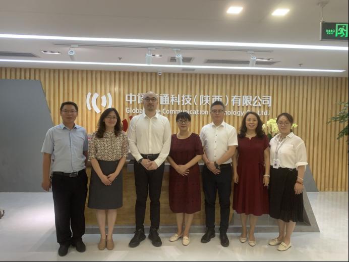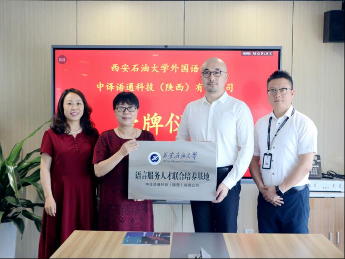 2021年6月8日,外国语学院党委书记田虹霞、院长于艳英、党委副书记王业青、副院长刘辉一行人走访我院翻译硕士人才联合培养基地中译语通科技(陕西)有限公司,并进行了“语言服务人才联合培养基地”和“大学生就业见习基地”的揭牌仪式。