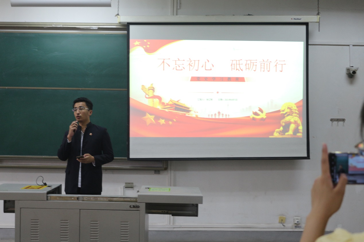 宣讲现场,徐汇轲同学围绕“不忘初心,砥砺前行”这一主题,从全面了解党史、把握党史学习重点和党史发展的核心、了解习近平新时代中国特色社会主义思想几方面,为全体参会人员讲述了中国共产党的历史。徐汇轲同学在宣讲中谈到,作为青年学生,要从百年党史中汲取智慧和力量,在党史学习教育中厚植爱党、爱国、爱社会主义的情感,坚定不移听党话、跟党走,做到学史明理、学史增信、学史崇德、学史力行,争做担当民族复兴大任的时代新人。