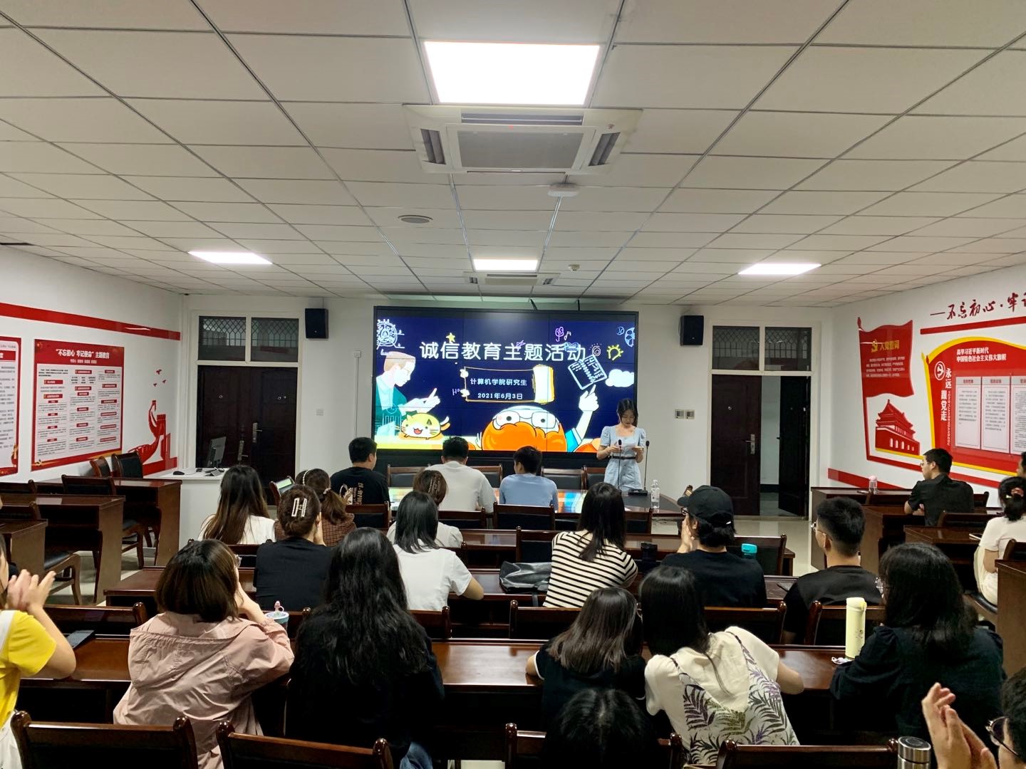 为了进一步加强研究生诚信教育,培养广大研究生奋发努力、自强不息的精神,践行社会主义核心价值观,树立“诚信待人,诚信处事,诚信学习,诚信立身”的高尚品德,计算机学院于2021年6月3日晚,在鄠邑校区C1楼112举办了研究生“学术诚信活动月”活动。研究生辅导员李路,本科生辅导员李晨、王天航,2018级研究生代表孟泰宇、丁恒,2020级研究生参加了本次活动。