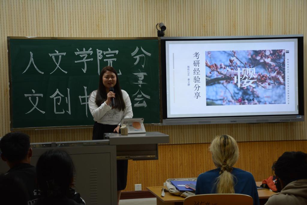 为了加强低年级同学对考研的认识,明确自己的考研目标,人文学院文创中心于2021年4月28日晚19:00在崇文楼235组织了考研分享会。通过分享考研经验,帮助同学们更好的高效学习,合理规划,本次分享会邀请了2017级优秀考研学生代表杨欣和曹文静分享经验。