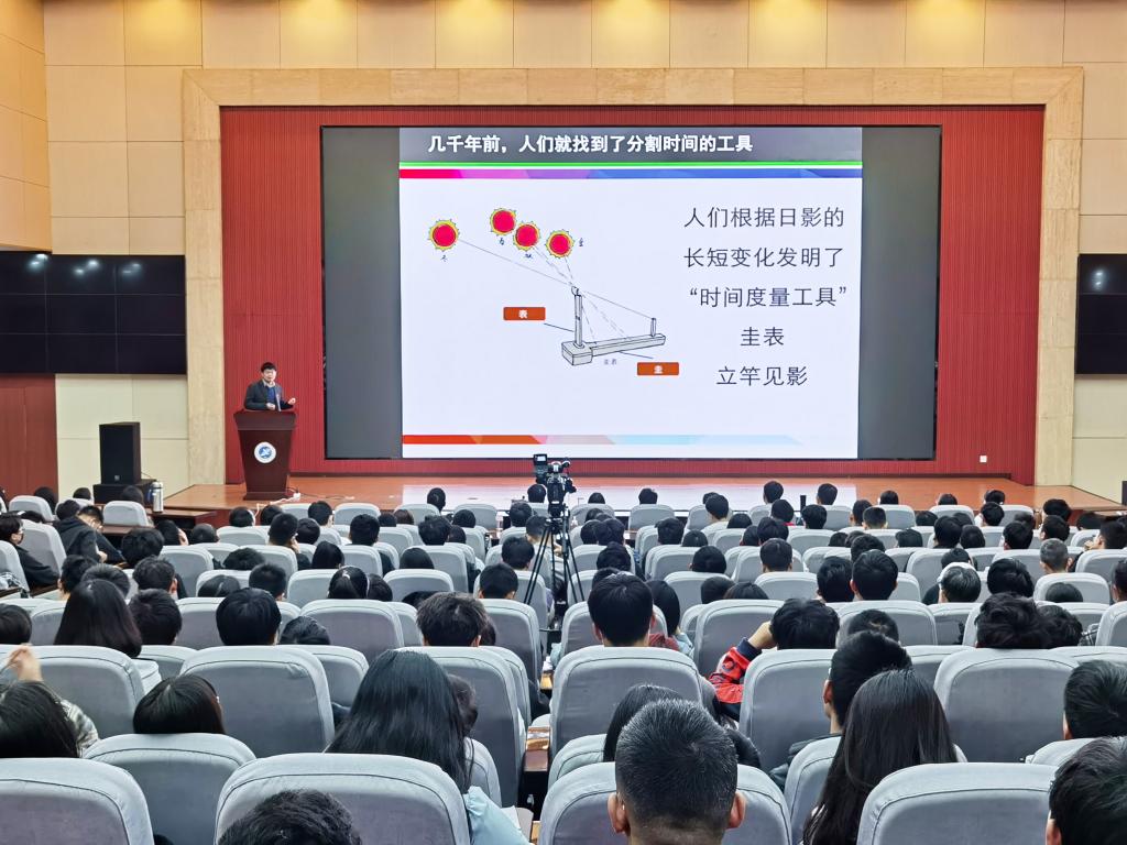 刘涛教授首先从时间的定义入手,对原子时、闰秒、时间的应用、生活中的时间等进行了通俗易懂的讲解。他讲到,时间精度的飞速提高,体现着人类探索自然、征服自然的强大力量和最高智慧。为了取得更精准的时间,目前世界各国都采用原子钟组来产生和保持时间,通过电话、互联网、卫星等各种手段将时间频率信号送达用户的整套服务系统,就称为“授时系统”。接着,刘涛教授介绍了开展的研究工作。光纤时间频率传递是目前最高的技术手段,他带领团队经过10年的攻关,突破了超高反射镀膜、精密光学冷加工等关键技术,研制出国内首台超高精细度光学参考腔,解决了超稳激光器核心部件的国产化,打破了美国技术垄断;攻克多站点时间同步新技术,国内首次在千公里实地通信光纤上实现十皮秒级时间传递,建成了长距离通信光纤时间频率传递试验系统,保障了北斗导航测试评估系统和国家长短波授时系统的时间频率溯源。最后,刘涛教授寄语莘莘学子,个人的发展与国家紧密相关,努力学习,掌握本领,才能报效祖国。