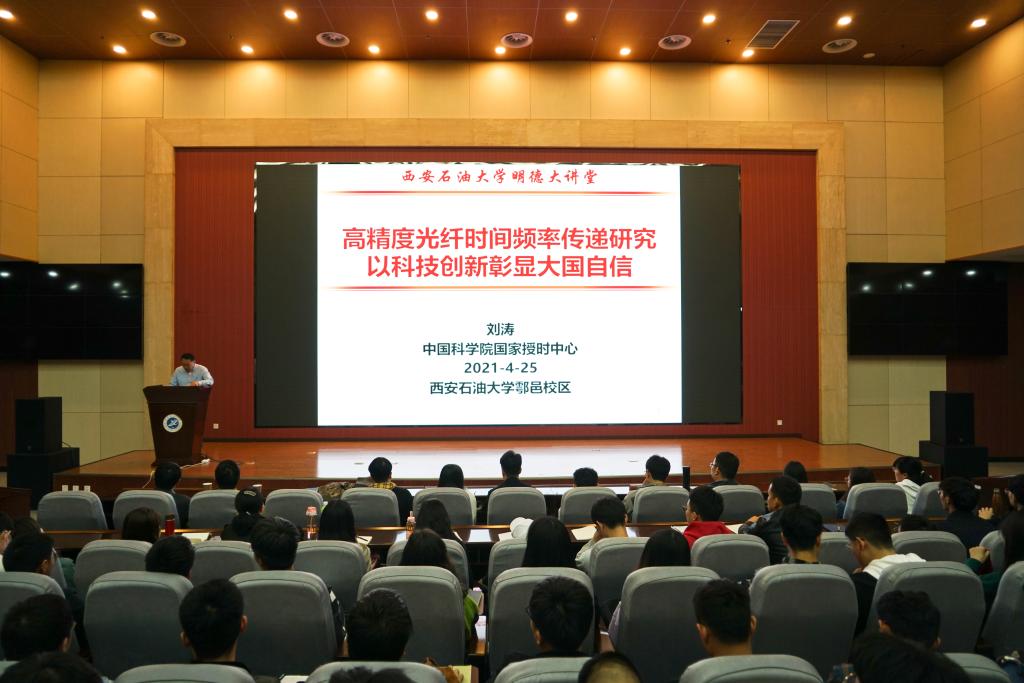 4月25日下午,由校团委和理学院主办、理学院团委承办的beat365第七十期“明德大讲堂”《高精度光纤时间频率传递研究——以科技创新彰显大国自信》在鄠邑校区图书馆弘石报告厅精彩开讲。本期嘉宾是中国科学院国家授时中心二级研究员、中国科学院大学刘涛教授,理学院党委副书记马小刚主持报告会,全校400余名研究生和本科学生共同聆听了精彩讲座。