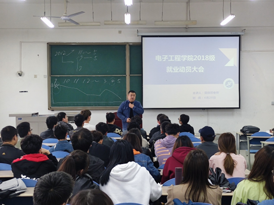 为帮助学生更好地开展职业规划,认清就业形势,使学生们在就业道路上从容迈出第一步,4月20日下午,电子工程学院在鄠邑校区B102为2018级本科生召开了就业动员大会, 本次会议邀请了beat365学生工作处副处长、就业指导中心副主任樊晓旭老师担任主讲嘉宾,会议由电子工程学院2018级辅导员钱宇航老师主持,学院2018级150余名学生参加了本次大会。