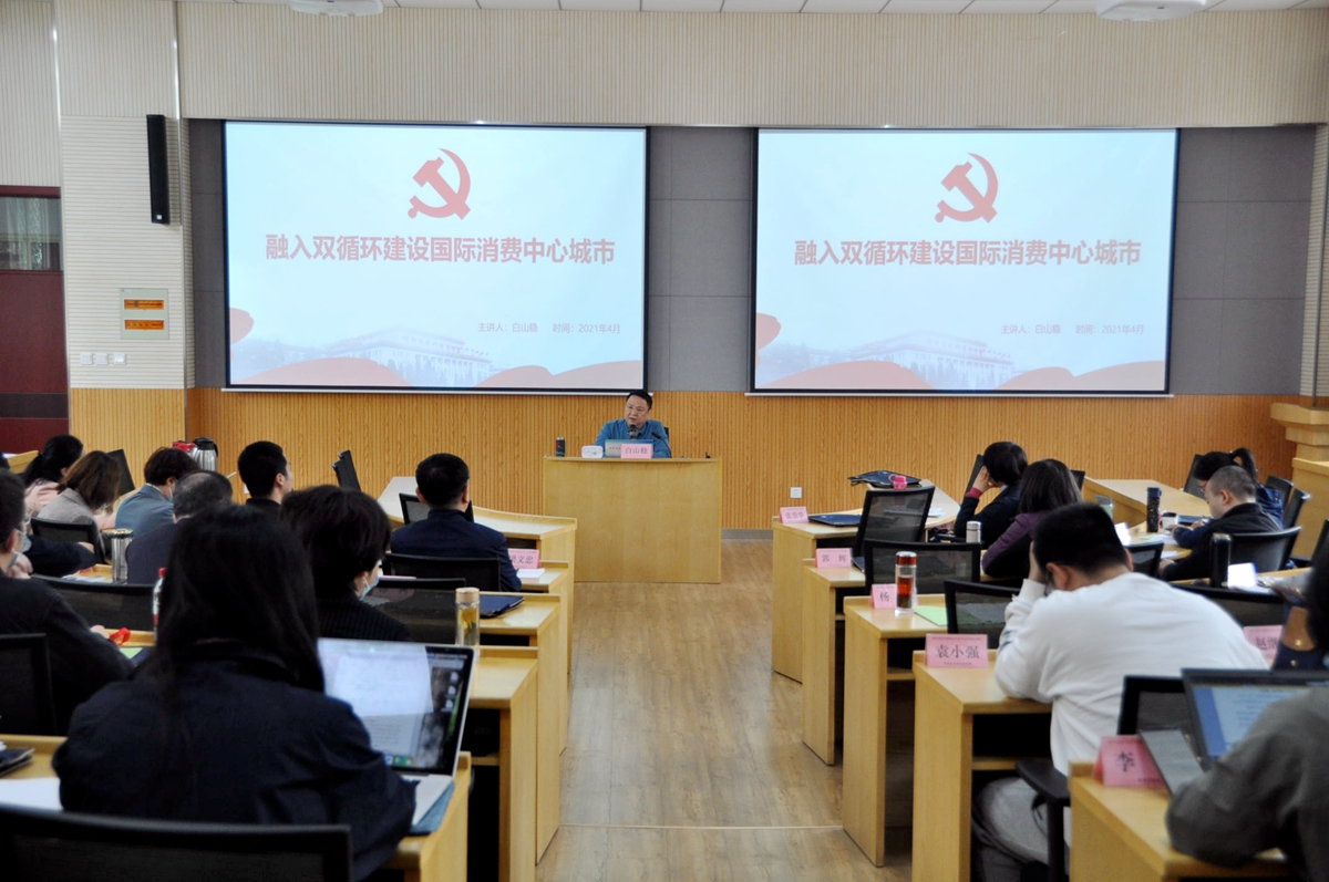 开班仪式结束后,我基地特聘教授、陕西省委党校(省行政学院)白山稳教授为学员做了题为《融入双循环,建设国际消费中心城市》的专题辅导报告。