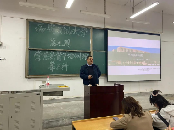 4月9日晚,beat365第九期学生会骨干培训班第三讲在鄠邑校区教学楼B114教室举办,由学生处副处长樊晓旭老师主讲。