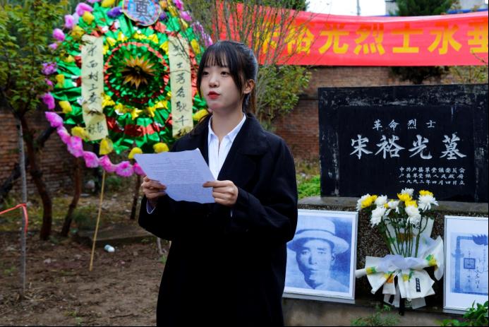 学生党员庞诗凡代表全体党员在烈士墓前致悼词,先烈虽逝,精神永存,深切缅怀革命先烈,向他们心怀家国、牺牲自我的革命精神致敬。她表示,新时代的学生党员一定会继承革命先烈的遗志,崇尚烈士、捍卫烈士、学习烈士,以习近平新时代中国特色社会主义思想为指引,在学习中争当优秀,在行动中坚守共产党员的初心和使命。