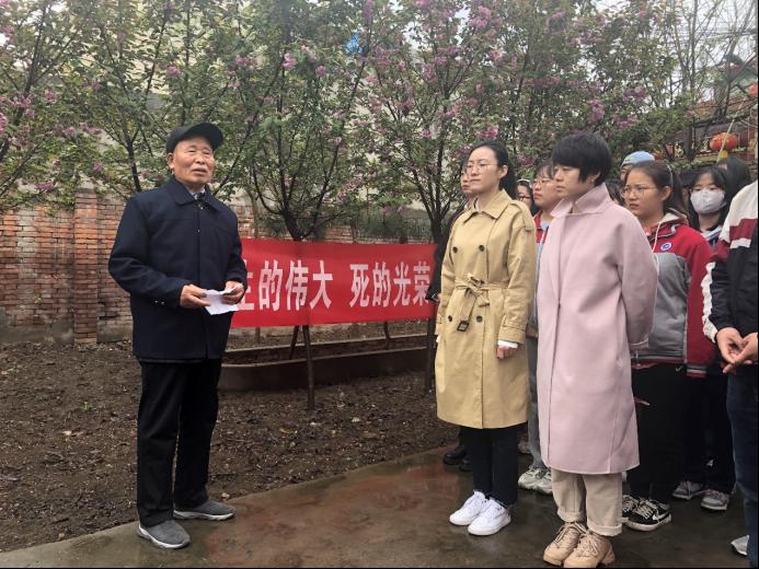 祭扫活动中,学生迈着整齐的步伐,庄严的向宋裕光烈士敬献了花圈,全体师生在烈士墓前默哀悼念,深切缅怀宋裕光烈士。随后,邀请烈士陵园的志愿者温老先生给同学们介绍了宋裕光烈士的生平事迹。温老师用饱含深情的话语讲述了宋裕光同志组织户县地下党开展打富济贫和抗粮抗捐等不屈斗争历史,讲述了他被内奸出卖被捕受到的严刑拷打而英勇牺牲的壮烈事迹。他希望年轻学生要坚定信念跟党走,牢记国家振兴民族复兴为己任的共产党人初心和使命。同学们认真聆听,仿佛回到了那个三座大山压迫着中国人民,中华儿女为争取和平而抛头颅洒热血的三十年代,在心中向无数宋裕光烈士一样的共产党员和仁人志士致以最崇高的敬意!