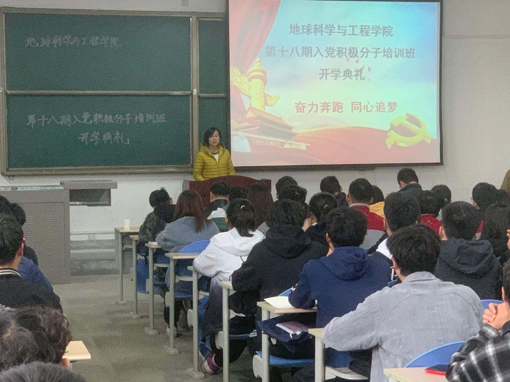 2021年4月1日下午四时,地球科学与工程学院第十八期入党积极分子培训班开学典礼在鄠邑校区B115教室顺利召开。开学典礼由学院党建办公室蒋清月同学主持,地球科学与工程学院党委书记马行天老师、副书记王莹老师、团委书记邱岭老师、党委组织员张阳老师以及107名入党积极分子参加了开学典礼。