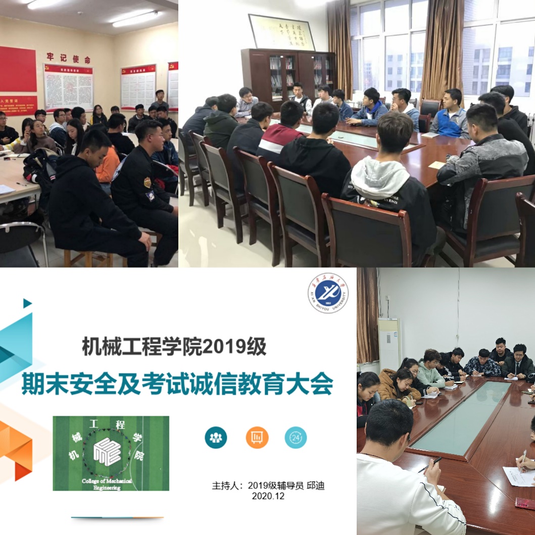 时值元旦假期与寒假来临之际,为贯彻省、校关于疫情防控的相关部署,保证全院学生能顺利完成本学期学业、平安地开启假期生活,机械工程学院各年级于12月27-30日通过线上线下结合的方式召开期末安全教育暨考试诚信教育大会。各年级辅导员主持会议。