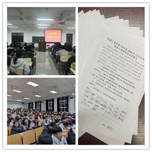 12月7日-9日,机械工程学院分年级、分批次召开英语四六级考试诚信教育大会,各年级辅导员老师主持会议,大会分别做考前动员和诚信教育。