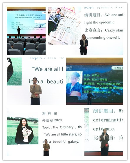 决赛当晚,选手们从党中央带领全国人民抗击疫情的决心,白衣天使不畏生死奋战一线的职业素养,“停课不停学”的网络课堂教学创新,当代青年勇于担当参与疫情防控等多维度、多角度表现出了对“众志成城、抗击疫情”主题的理解和认识。有的语言流畅、思维敏捷,有的饱含深情、激情阐述,台上比赛精彩纷呈,台下观众掌声不断。经过近4个小时的激烈角逐,最终外国语学院韩婷婷、人文学院曹羽习荣获一等奖,外国语学院吴芷蕾、人文学院张晨晨等5名同学获二等奖,外国语学院刘祎铭、石油工程学院袁有金等8名同学获三等奖,经济管理学院黄海云等6名同学获得优秀奖。