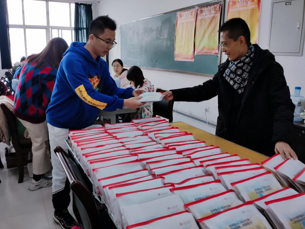 随后,老师们为每一位考研学子发放了“考研加油包”,包括考试文具套装、考研祝福语卡片等实用且贴心的小物,为即将考研的各位学子带去了一份温暖、增添了一份动力。