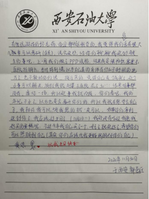 我院2020级辅导员李昱昊在总结活动时强调:社会在不断发展,时代在不断进步。越来越多的人通过语音视频等方式向亲人表达问候,但其实这种方式会有许多感恩的话语难以用语言表达,本次活动旨在于引导大家通过传统的书信加深与父母及亲友的情感沟通,懂得体会父母的不易,懂得父母的辛苦付出和默默承担,培养大家的感恩意识、责任意识、独立人格。