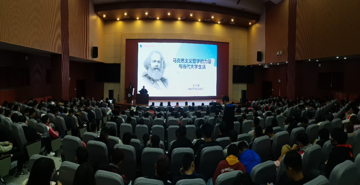 本次讲座主要有两部分,即马克思主义哲学在现当代社会中的价值及其与如何指导当代大学生活。石少虎老师首先抛出两个问题,即“何为哲学”和“哲学又为何”,又以幽默风趣的语言讲述了季羡林先生的故事和“三人行必有我师”的例子,给出自己的解答——哲学是万物的本源,是智慧,是乐趣。通过问题和事例引发大家的思考,进而引入本次讲座的第一个主题——马克思主义哲学,石老师向同学们介绍了三个方面的内容:马克思主义当代价值的理论挑战、马克思主义的理论阐释、坚定马克思主义的理论自信,通过对上述论点深入浅出地精彩讲解,使得同学们对马克思主义哲学当代价值的认识更加明晰。随后,石老师引入“马克思主义哲学与大学生活”这一核心观点,他认为,大学的生活与责任即是要学会辩证地看待问题、要敢于人先大胆创新。在介绍完马克思主义哲学与大学的联系之后,石老师用同学们乐于接受的语言方式讲述了历史上的名人事例,并对比古今中外思想成果,探寻了人类思想发展的脉络,更新了同学们对马克思主义思想的高度,更是让同学们对于马克思主义在未来中国发展产生了更美好的憧憬与强烈的自信。