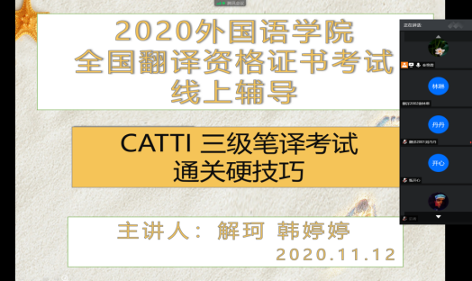 11月12日(星期四)19:00 – 20:30,外国语学院通过腾讯会议平台,举办了全国翻译资格证书三级笔译考试线上辅导讲座。本次讲座由外国语学院翻译系副主任秦艳霞老师主持。讲座邀请了外国语学院MTI2018级研究生解珂、韩婷婷为学院翻译系和英语系全体本科生线上进行了备考经验分享,她们二人目前均持有CATTI二级笔译证书。