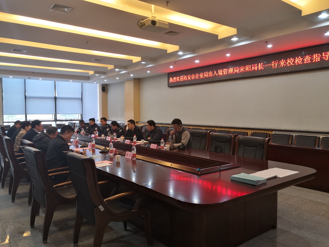11月11日下午,西安市公安局出入境管理局局长宋阳等来beat365鄠邑校区就留学生签证及留学生日常管理等工作进行调研和督查,调研座谈会在鄠邑校区图书馆第二会议室举行。市公安局出入境管理局外管一科、鄠邑分局外事警官,beat365鄠邑校区管理办公室、保卫处、国际教育学院等部门有关人员参加调研和座谈。