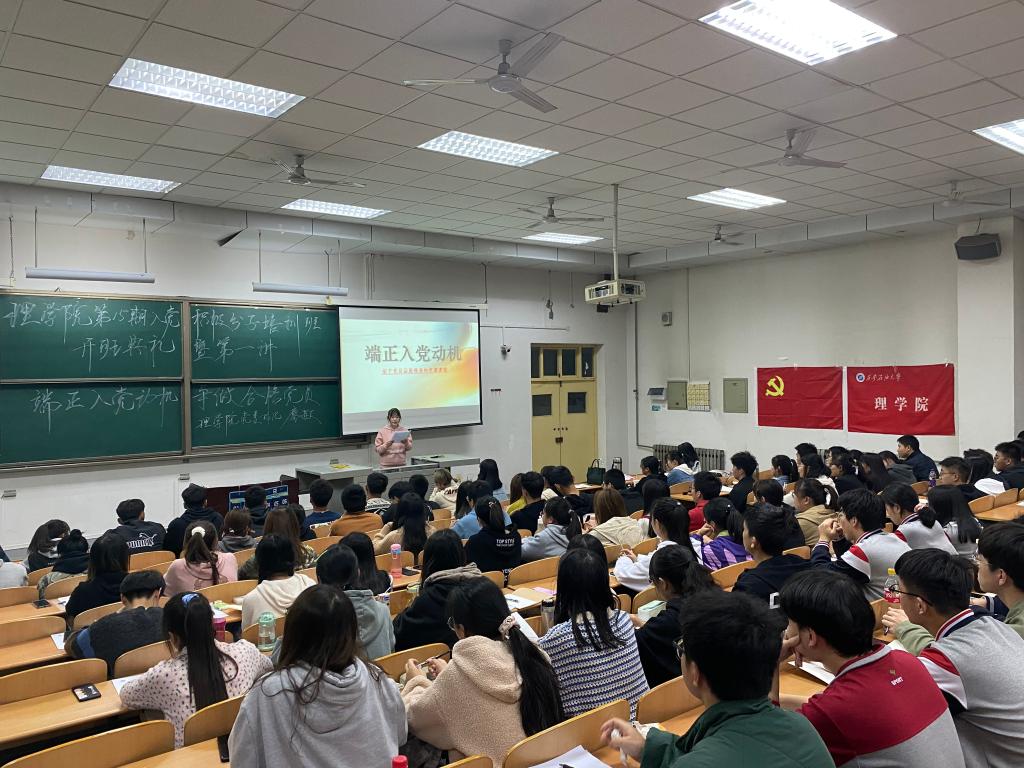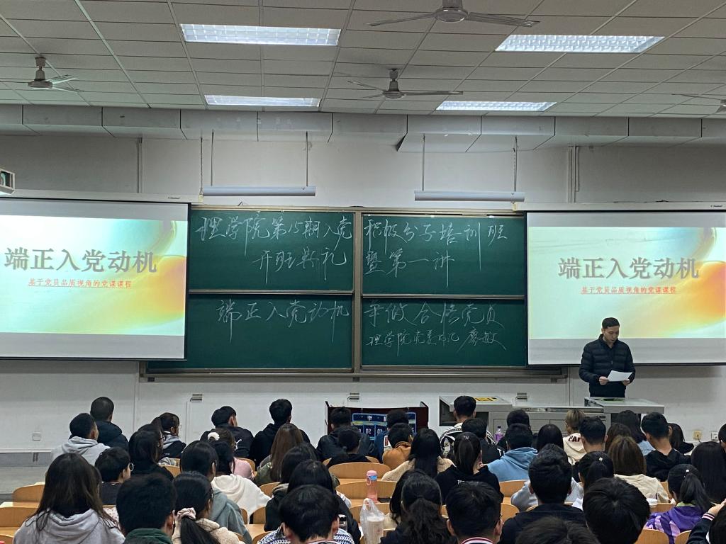 11月9日晚19点,理学院第十五期入党积极分子培训班开班典礼暨第一讲——“端正入党动机,争做合格党员”在鄠邑校区教学A区239教室举行。理学院党委书记廖敏老师主讲,学生管理办公室主任丁亦喆老师主持,各年级辅导员及200名学员参加学习。