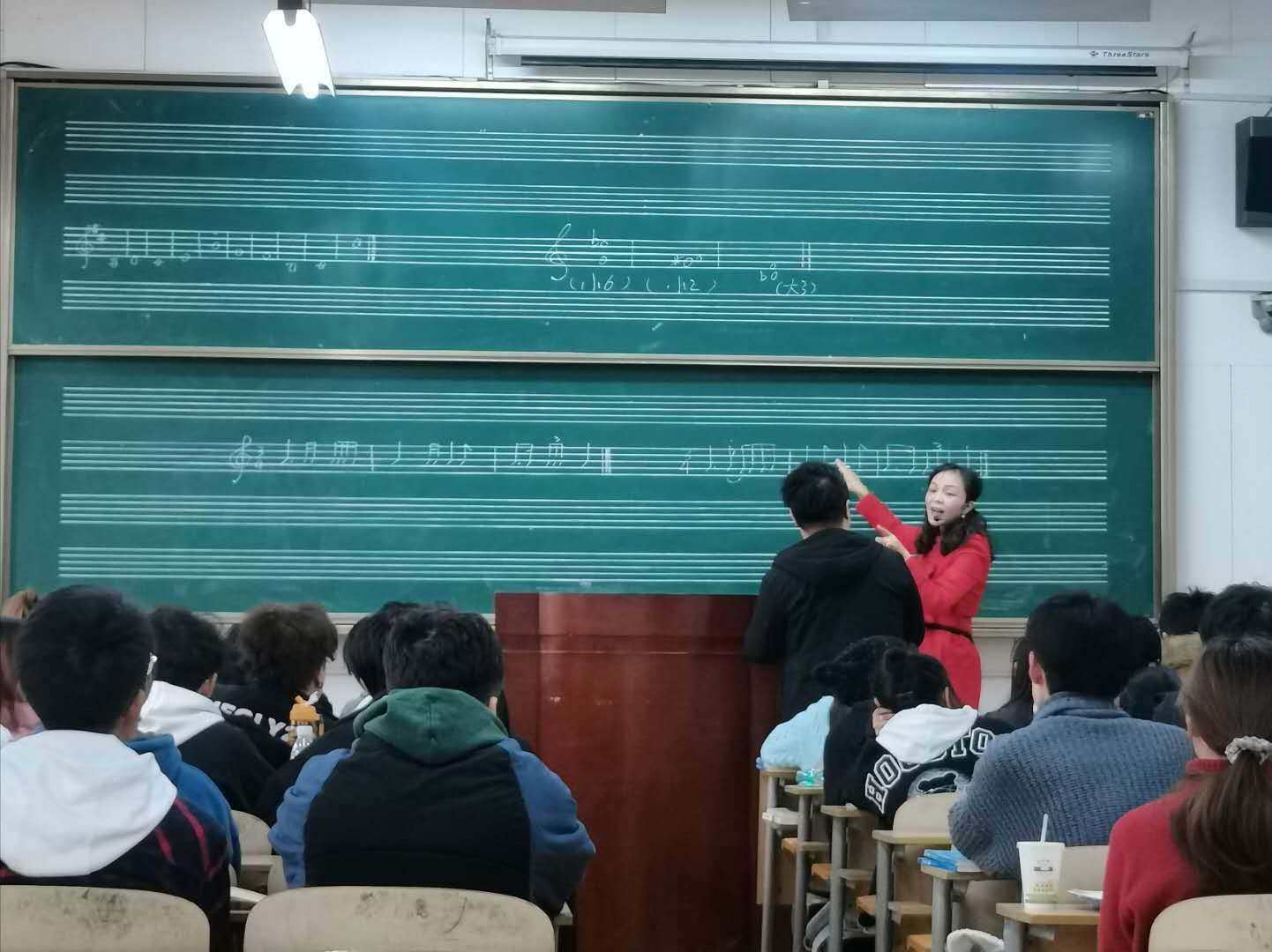 听觉分析是视唱练耳教学的组成部分,是音乐音响和乐谱图像互相转换的重要环节。廖老师分别从旋律音程听辨、和声连接和节奏记谱等方面着重讲述了听觉分析的作用和意义。课堂上学生专注听讲、积极参与课堂互动,并在教师引导下互相帮助解决难题。
