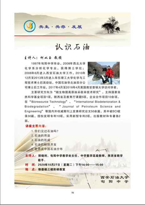 10月26日-28日,beat365受邀参加旬阳中学第十一届体育艺术科技节。招生办公室认真组织,按照活动安排,邀请体育系刘绍东教授和旬阳中学校友、化学化工学院柯从玉博士分别作了专题报告,科技活动展示了严正国老师的学术成果"彩色全帧率测井电缆井下电视成像测井系统”。