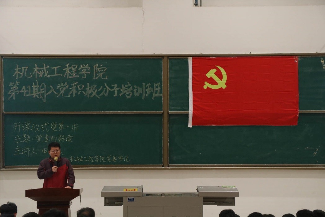 为提高我院入党积极分子的党性修养,严肃党的组织生活制度,提升积极分子学习的主动积极性,根据学院党委的统一安排, 10月29日晚,机械工程学院在鄠邑校区石工地科楼115教室举行第41期入党积极分子培训班开班仪式暨第一次集中授课。机械工程学院党委书记田党宏为全体入党积极分子授课,团委学生会指导老师邱迪参加并宣读党课纪律与要求,开班仪式由院团委书记文爱国主持。