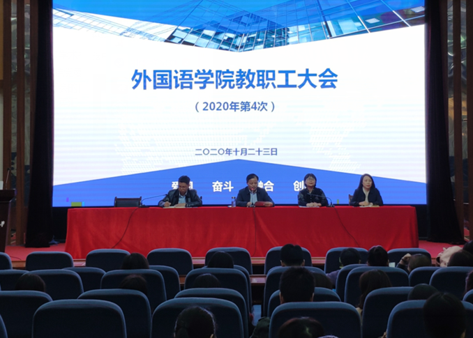 10月23日下午,外国语学院在雁塔校区学术报告厅召开全院教职工大会。全院教职工参加会议,会议由学院党委书记蔡强主持。