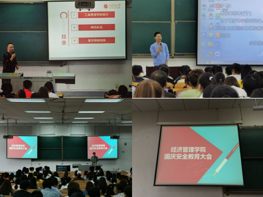 为落实学校党委学生工作部《关于做好国庆中秋假期有关工作的通知》(学工函〔2020〕21号)要求,扎实做好安全稳定各项工作,落实防疫工作整体要求,经济管理学院于2020年9月29日至9月30日各年级分别通过现场年级大会、网络视频、线下班会等方式开展国庆中秋假期安全教育。