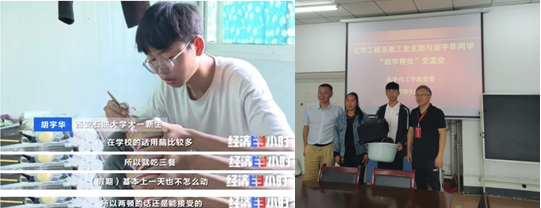 胡宇华来自贵州省毕节市大方县,是我院2020级化学工程与工艺专业新生,他刻苦努力,自强不息的求学之路,经央视财经频道《经济半小时》栏目报道后,得到社会各界的广泛关注。学校通过媒体立即联系学生本人,并启动相关资助程序;校领导在学生处的各位领导的陪同下也在报名当天看望了胡宇华同学及其母亲,并为其送去了免费被褥用品领取券,减轻了生活上的负担。学院党委了解到情况后,及时与胡宇华同学取得联系,安排辅导员专门与学生具体沟通并给给予相关帮助。同时,荣获了“陕西省2020年高等教育师德建设示范团队”称号的化学工程系党支部主动汇报学院党委,拟启动支部与胡宇华同学的对口“助学帮扶”活动,希望通过化工系教工党支部的力量,给予该同学大学四年期间学业生活持续帮扶,使其在学业上能取得更大的成就,以此来回报父母、回报社会。