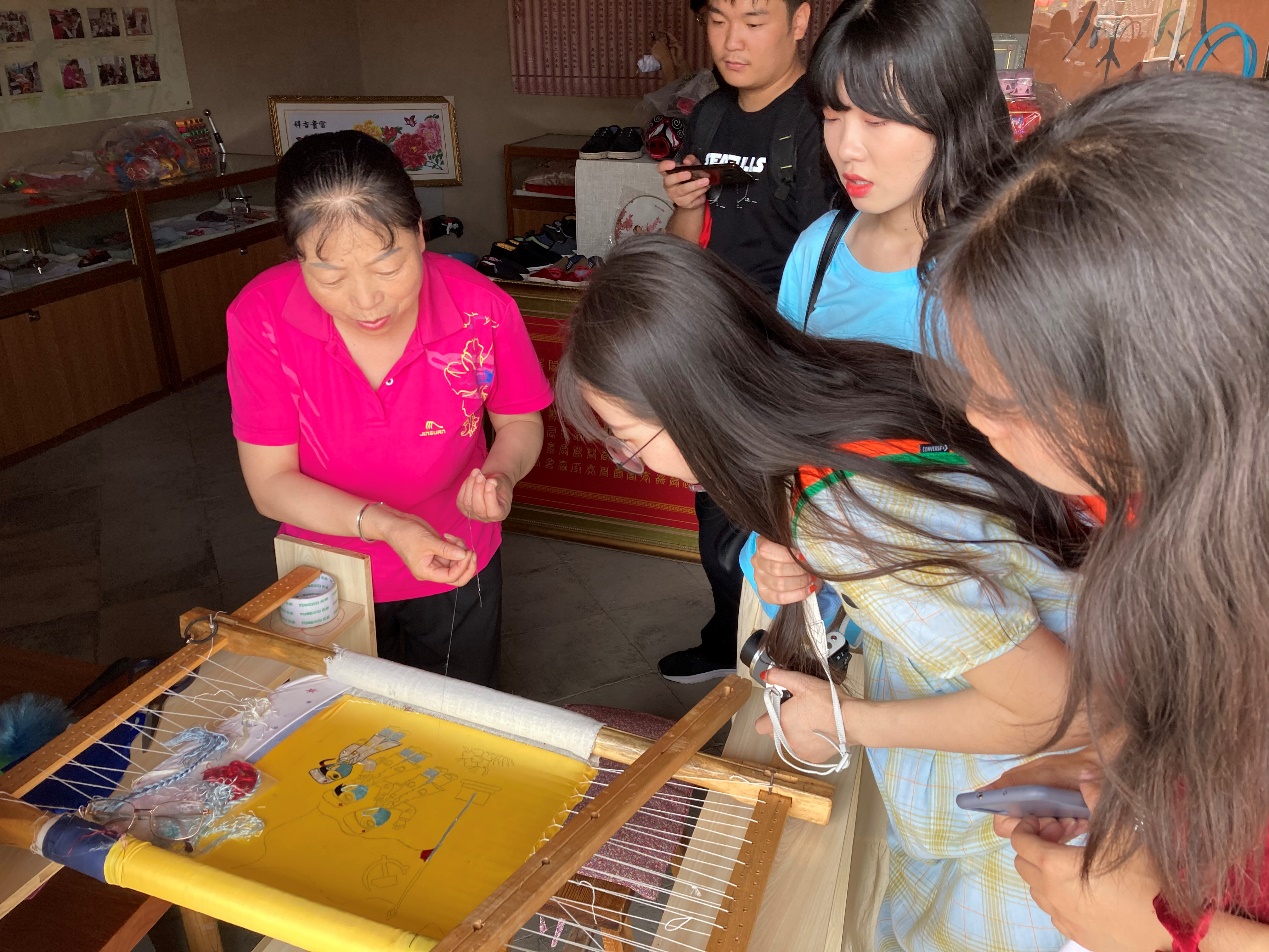 8月1日,团队于早上九点到达第一个调研地点秦人部落。木桩围成的一块与城市相隔的地方,旌旗飘飘,古朴的建筑让人仿佛穿越到了古代。伴着古典的背景音乐,我们饱览了秦人军队的雄风,走过长长的民俗街道,当地的美食与秦人手工艺品吸引着我们的眼球。其中最让人记忆深刻的便是姜女秦秀。在这之前,我们只听闻过蜀绣,苏绣。今天才了解到秦秀,一个与孟姜女有关的传统绣法。秦秀的特点显著,例层次多、立体感强:秦绣不同于传统刺绣的长针掺线,它是在真丝纱络上用真丝线依照经纬网眼施针,一孔一针或几孔一针。由于针的走向不同,使图案花纹,画面变幻多端,花中套花。针法的不同还使得绣线产生不同反光,同一色线形成不同的色彩效果,彰显出真丝线材质的缤纷美感。秦绣作品中,小花纹的微妙变化与大块面色彩经常对比运用,此时画面生出层次和立体感,增加了整幅绣品格调的瑰丽典雅。