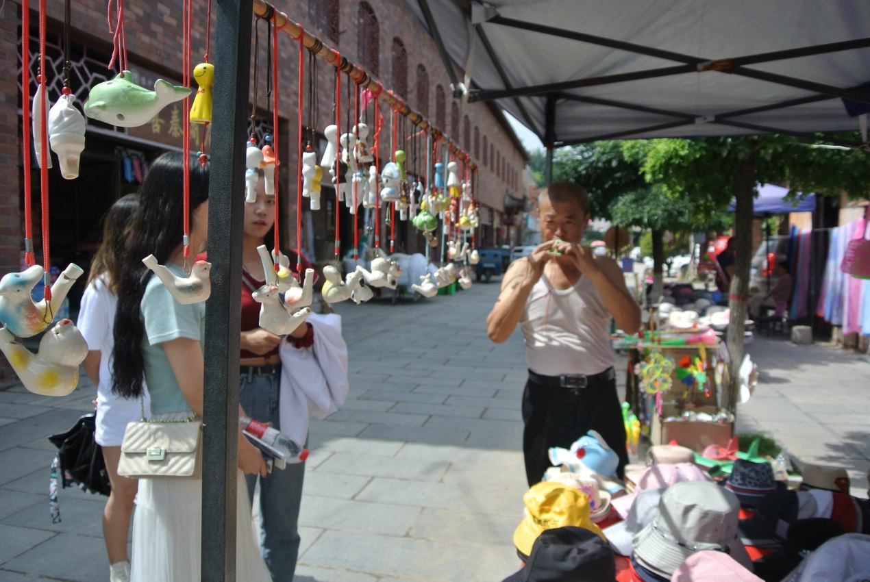 还有各式样的陶瓷玩具,在贩摊上最吸引游客的便是陶笛类的乐器。在一家摊贩前,买陶埙的大叔还为我们现场表演了一番那件海豚形状的陶器乐器。陶器不仅仅用于器具,观赏性的摆件,在这里也被发掘为一种乐器,丰富的形式让这件工艺品更具价值。不由得让人心动购买它。在镇子里还可以亲手制作陶器,亲身感受陶文化的魅力。这里不需要解说,那些肉眼可见的陶器,指尖触碰到的古镇,都诉说着这个古镇的点点滴滴。