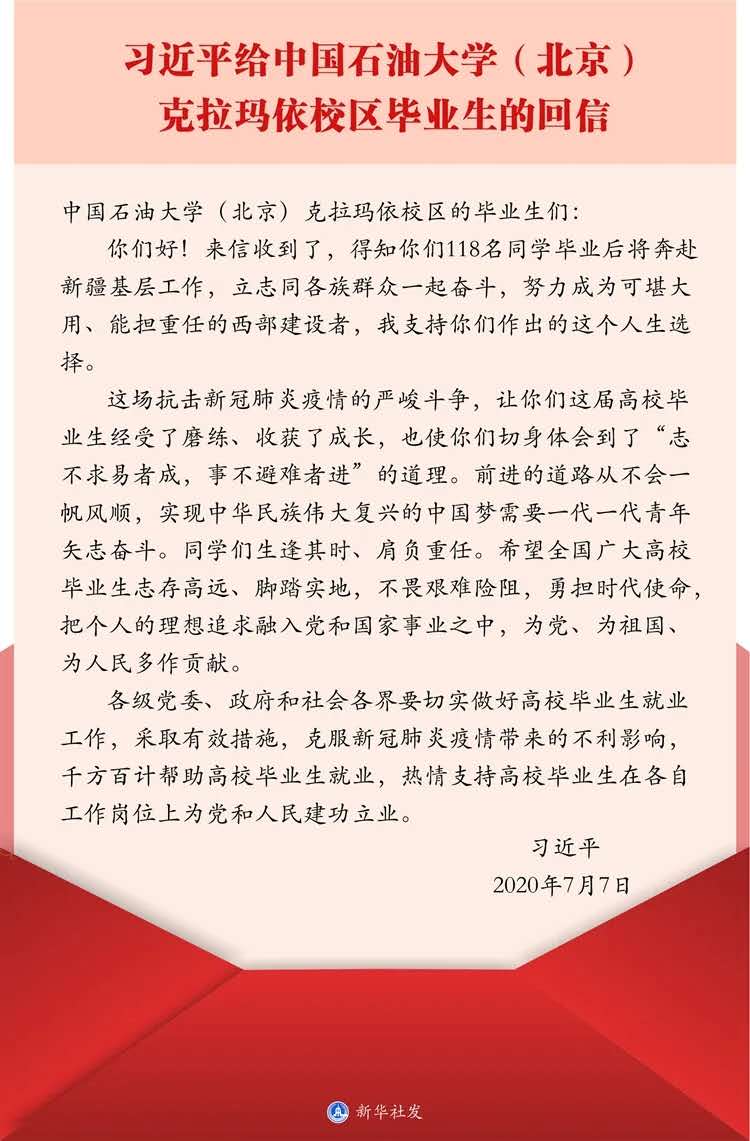 中共中央总书记、国家主席、中央军委主席习近平7月7日给中国石油大学(北京)克拉玛依校区毕业生回信,肯定他们到边疆基层工作的选择,对广大高校毕业生提出殷切期望。习近平总书记这封饱含期待与鼓励的回信,在机械工程学院青年学子中迅速引发了热议。