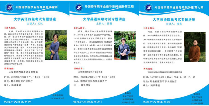 为了让我校学生全面了解大学英语四级考试,提升大学英语四级通过率,在教务处和学生工作部的支持下,外国语学院于6月29日至7月7日分别举办五场大学英语四级讲座。此次讲座面向全校学生,以线上和线下两种方式进行,线下主会场设在鄠邑校区弘石学术报告厅,分会场设在各四级强化辅导班教室,线上使用腾讯课堂直播,截至目前为止beat365共有5342名同学通过线上线下方式参加了此次系列讲座。