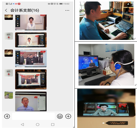 观看党课后,学院师生党员展开线上线下讨论。学院党委委员吴勋同志说到,我们要牢记来时走过的路,坚守三尺讲台,为党育人、为国育才,不忘教书育人初心,牢记教育报国使命。党委委员苟三勇同志指出,从1921年到2020年,中国共产党初心未变、使命在肩,始终坚持为中国人民谋幸福,取得了一个又一个胜利。在新的形势下,我们要进一步加强理论武装,在学思践悟中坚定理想信念,在奋发有为中践行初心使命。企管系教工党支部书记杨晶谈到,中国共产党已经走过第一个99年,不容易,离不开我党先驱们的努力。要走过第二个、第三个99年,也不容易,离不开我党后来人的奋斗。只有薪火相传,继续在00后、10后中扩大党员的规模和质量,我党为人民服务的宗旨才能传承,为人民服务的事业才能继续。教工党员王言同志强调,99年是一段百折不挠艰辛求索的伟大历程,它使古老的中华大地天翻地覆,焕然一新,我相信以人民至上、无私奉献的共产党人,将在新时代带领中华民族走上富强繁荣的道路。人力系学生党支部邢晓晓同志说到,2020年是特殊的一年,新冠肺炎疫情在全国爆发开来,一时间全国陷入紧张的气氛,但即使在如此危险的时刻也仍有无数共产党员挺身而出,用自己的力量为国家的防控疫情攻坚战做出贡献。值此之际,祝中国共产党99周年生日快乐!经济系学生党支部杨凯睿同志指出,观看战“疫”示范微党课,让我倍受鼓舞,在今天这个特殊的日子里,四大高校,多名主讲人,从各自的视角,讲述了共产党人的责任与使命,在抗击疫情当中他们不畏艰险,在脱贫攻坚战中他们砥砺前行。