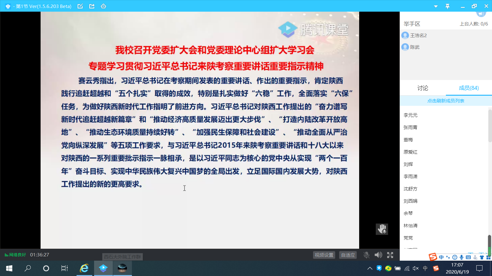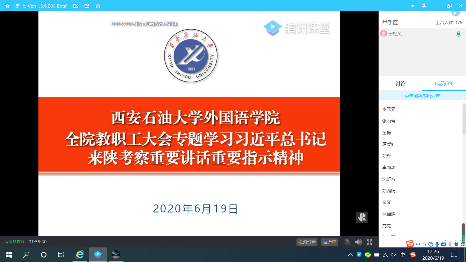 6月19日下午,外国语学院通过腾讯课堂的方式召开全院教职工大会,专题学习习近平总书记来陕考察重要讲话精神。全院教职工参加会议,会议由学院党委书记蔡强主持。
