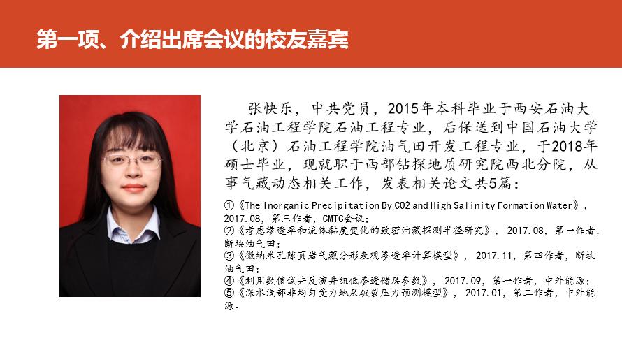 为进一步巩固《大学生职业规划与就业指导(2)》课程效果,学习优秀校友经验,增强我院2021届毕业生个人职业规划能力与就业发展意识,石油工程学院于6月23日晚7时,利用线上腾讯会议举办优秀校友就业指导分享会。本次会议分别邀请到我院2010级校友、中石油管道分公司上倍尧,2011级校友、西部钻探地质研究院张快乐与中石油大港油田孙宇出席,会议由2017级辅导员孙浩哲主持,石工院2017级全体学生参加。