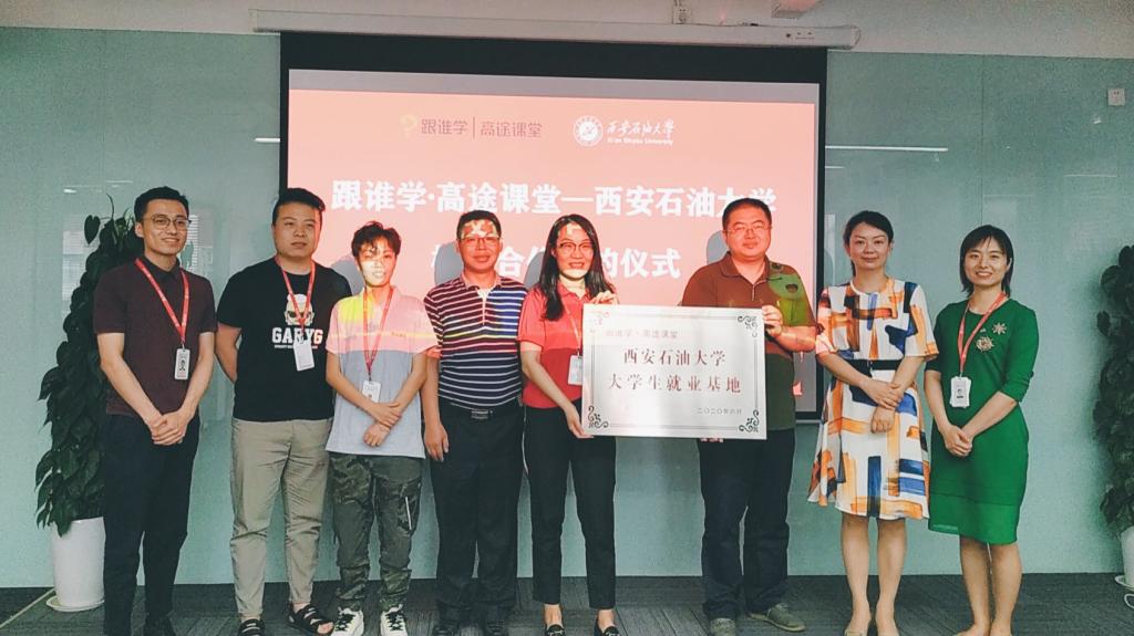 跟谁学•高途课堂西安公司宋思捷、校友代表与beat365经济管理学院学生管理办公室主任刘冰、2016级辅导员武威,人文学院学生管理办公室主任付强,外国语学院2017级辅导员陶李参加了就业基地签字仪式。