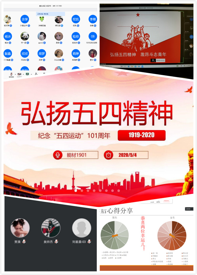 为纪念五四运动101周年,进一步引导广大青年团员继承和发扬五四精神,展现当代青年风采。2020年5月,材料科学与工程学院各班、团支部召开了以“传承五四精神,弘扬爱国情怀”、“青春向党、歌颂五四”等为主题的线上班团会。此次主题班团会准备充分,内容充实,形式多样。通过线上学习习近平总书记五四寄语和优秀青年事迹、唱团歌、经典诵读、知识竞答、观看五四精神纪录片等方式,号召广大团员不忘入团初心、牢记团员使命,以实际行动传承五四精神、弘扬爱国情怀。