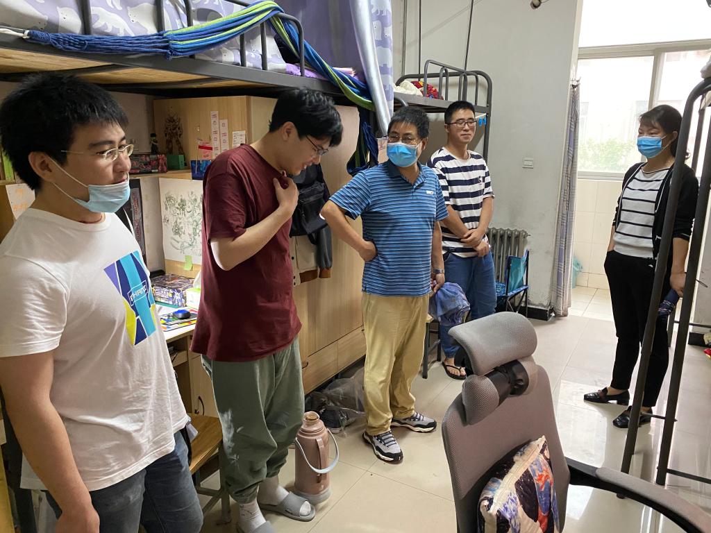 走访中,余书记向学生详细了解了宿舍卫生安全状况以及个人防护物品发放的情况,叮嘱他们特殊时期要做到勤通风、勤洗手、戴口罩。盛书记希望同学们保持乐观积极的心态和科学健康的生活方式,配合做好每日健康申报工作。学生们表示,理解学校在非常时期采取的封闭管理措施,将在日常生活中保持宿舍卫生及通风,不给疫情防控工作增加压力。
