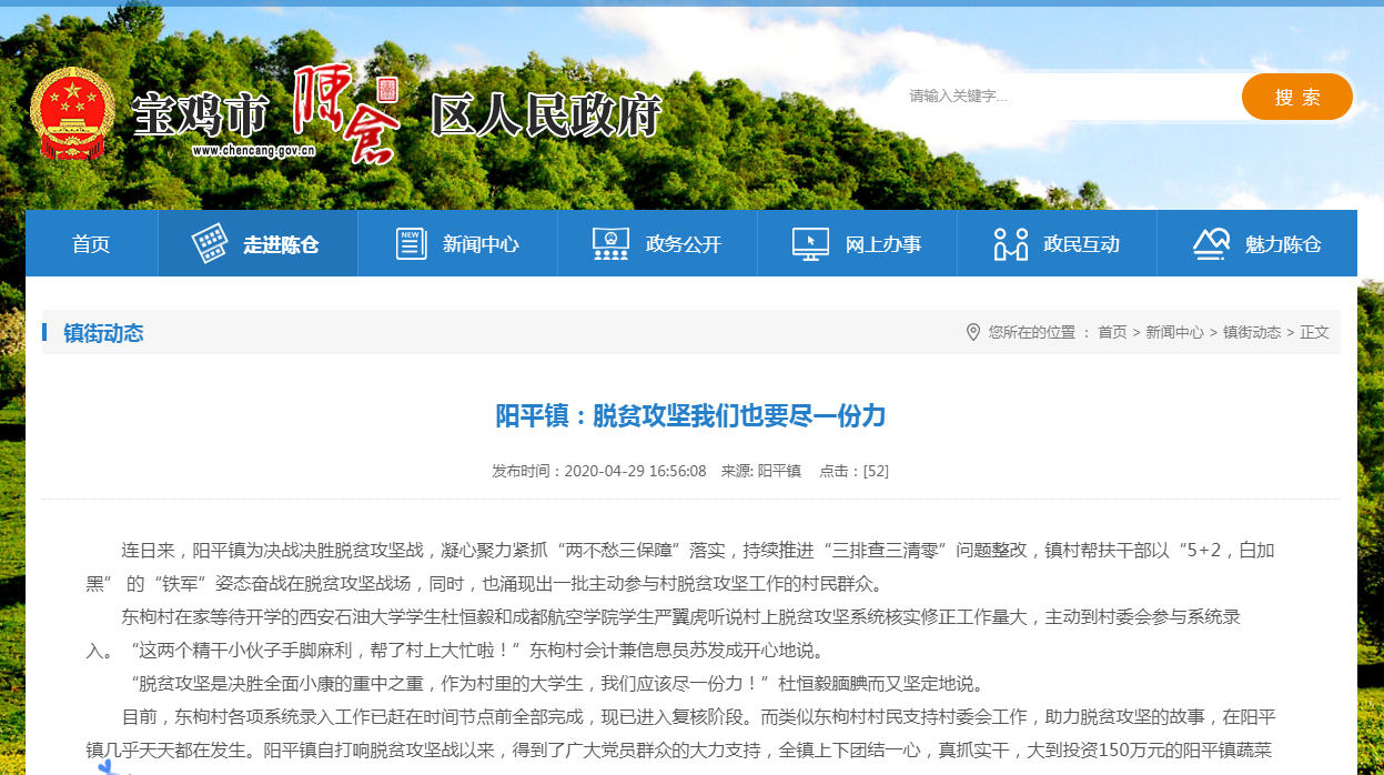 2020年是全国脱贫攻坚决战决胜之年,我们将全面建成小康社会,实现第一个百年奋斗目标。在脱贫攻坚全面收官的关键阶段,石油工程学院2017级杜恒毅同学,因积极志愿参与当地脱贫攻坚工作,近日受到宝鸡市陈仓区政府和《阳光报》报道宣传,该区人民政府特致电beat365,对该生进行表扬。