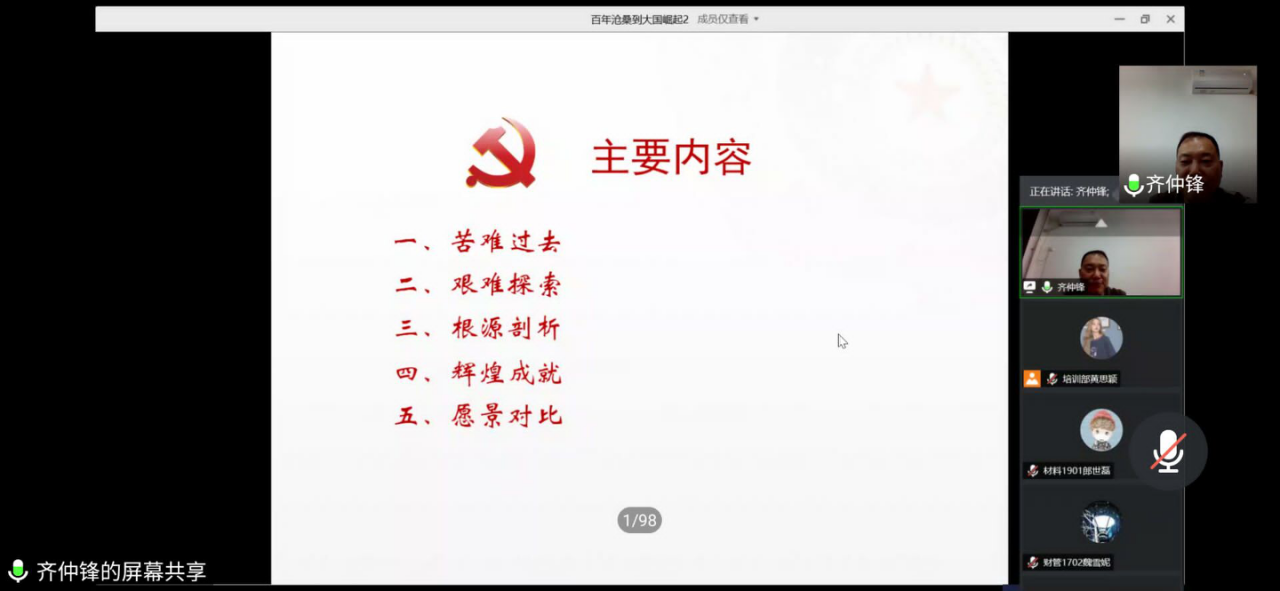 5月28日晚,经济管理学院第四十五期入党积极分子培训班第一讲通过腾讯会议APP平台,以线上授课的方式顺利举行。材料科学与工程学院党委书记齐仲锋以《从百年沧桑到大国崛起》为题担任主讲,经济管理学院同材料科学与工程学院近300名入党积极分子参加。