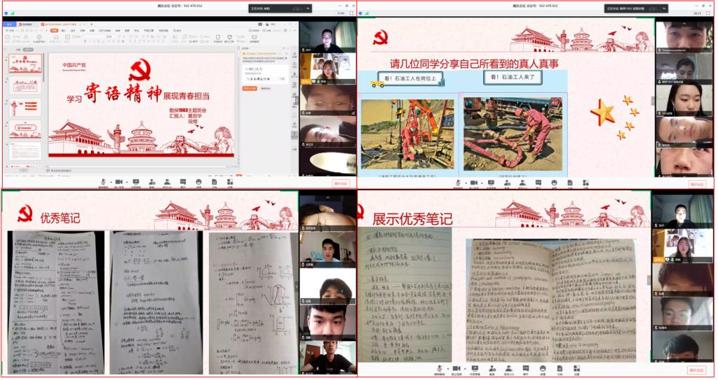 随后,班会展示了黄田华的古生物笔记,她的笔记面面俱到,涵盖面广;马舒霏的高数笔记,她的笔记条理清晰,精益求精;赵磊的古生物笔记,他的笔记字迹优美,赏心悦目;和丁丹丹的大学物理和C语言笔记,她的笔记详略得当,字迹工整。笔记展示结束后,班里名列前茅的杨浩原和李臻分享网课经验,同学们收益匪浅。