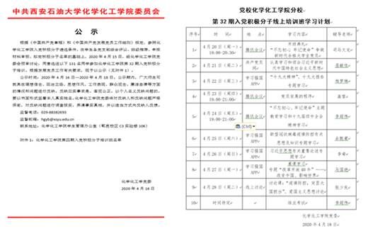 本次培训是化学化工学院党校第一次开展在线培训,为了做好此项工作,化学化工学院党委在修订“学生入党积极分子遴选基本条件(试行)”基础上,从政治思想、在校课业、学术竞赛、社会实践等多方面考察,经班团遴选推荐、党支部综合评议、学院党委审查公示等环节,本次共遴选了来自学院本硕6个年级共计131名学生参训。为进一步规范在线培训工作,化学化工学院党校提前选择网络平台测试、认真编制授课计划,组织学员分班分组,建立学习跟踪交流制度,严格学习过程考勤,对参训学员的到课出勤、笔记记录、心得撰写、交流讨论等进行全程记录,综合计算培训学习成绩。据悉,本次培训共设置9讲,采用专题报告、主题交流、音像教学相结合的形式,授课内容涵盖当前时事政治、党史党情、入党基本知识等内容。